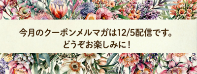 【メルマガ限定】 12月のメルマガ限定クーポンは、12月5日に配信予定です。ぜひチェックしてください。